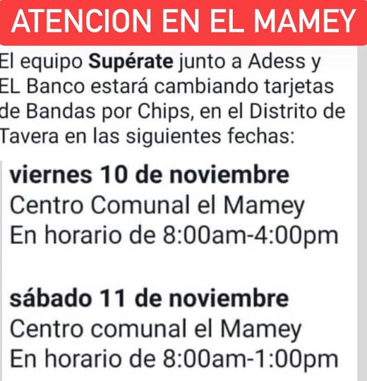 Atención y de sumo interés, en El Mamey a los que tienen tarjeta del gobierno, mañana viernes y el sábado se estarán cambiando a bandas por chips.